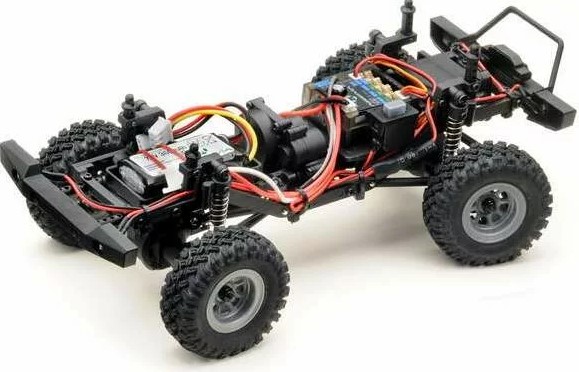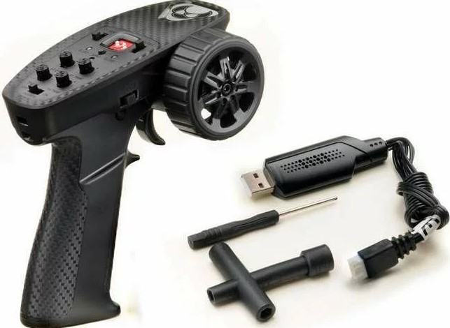 Ready to Race crawler-paketti, jonka mukana tulee lähes kaikki tarvittava: auto, radiolähetin, LiPo-akku, USB-latauskaapeli.
