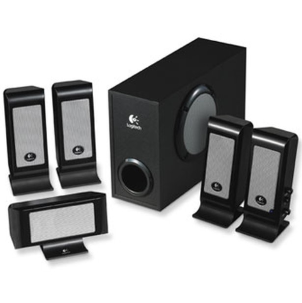 Langallinen 5.1 kaiutinjärjestelmä, jossa 4x satelliittikaiuttimia, 1x keskikaiutin ja 1x subwoofer.