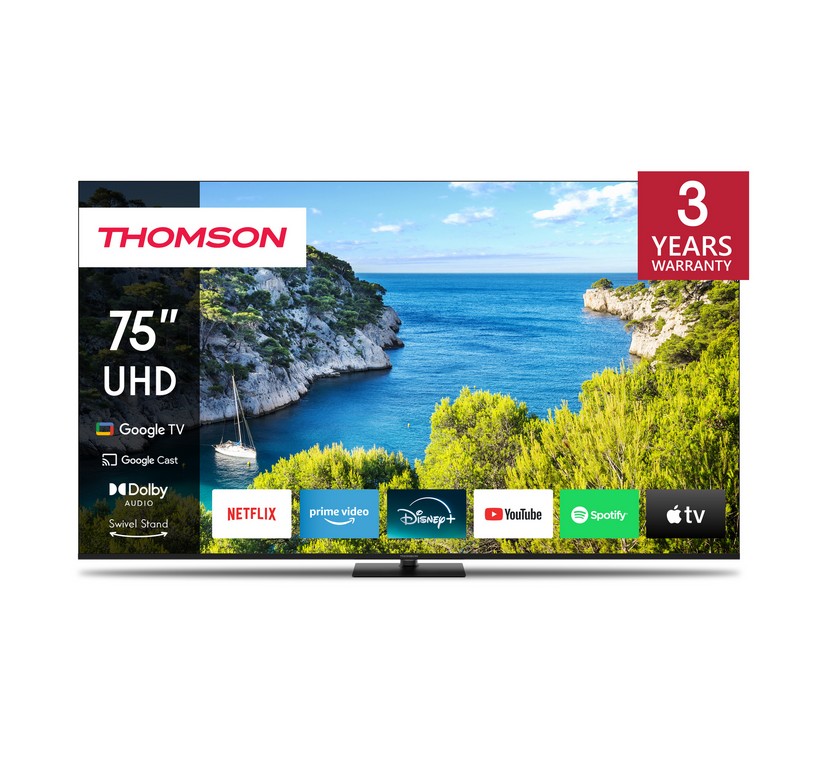 Kehyksettömällä muotoilulla toteutettu 4K UHD Google Smart TV isolla ja tarkalla paneelilla.